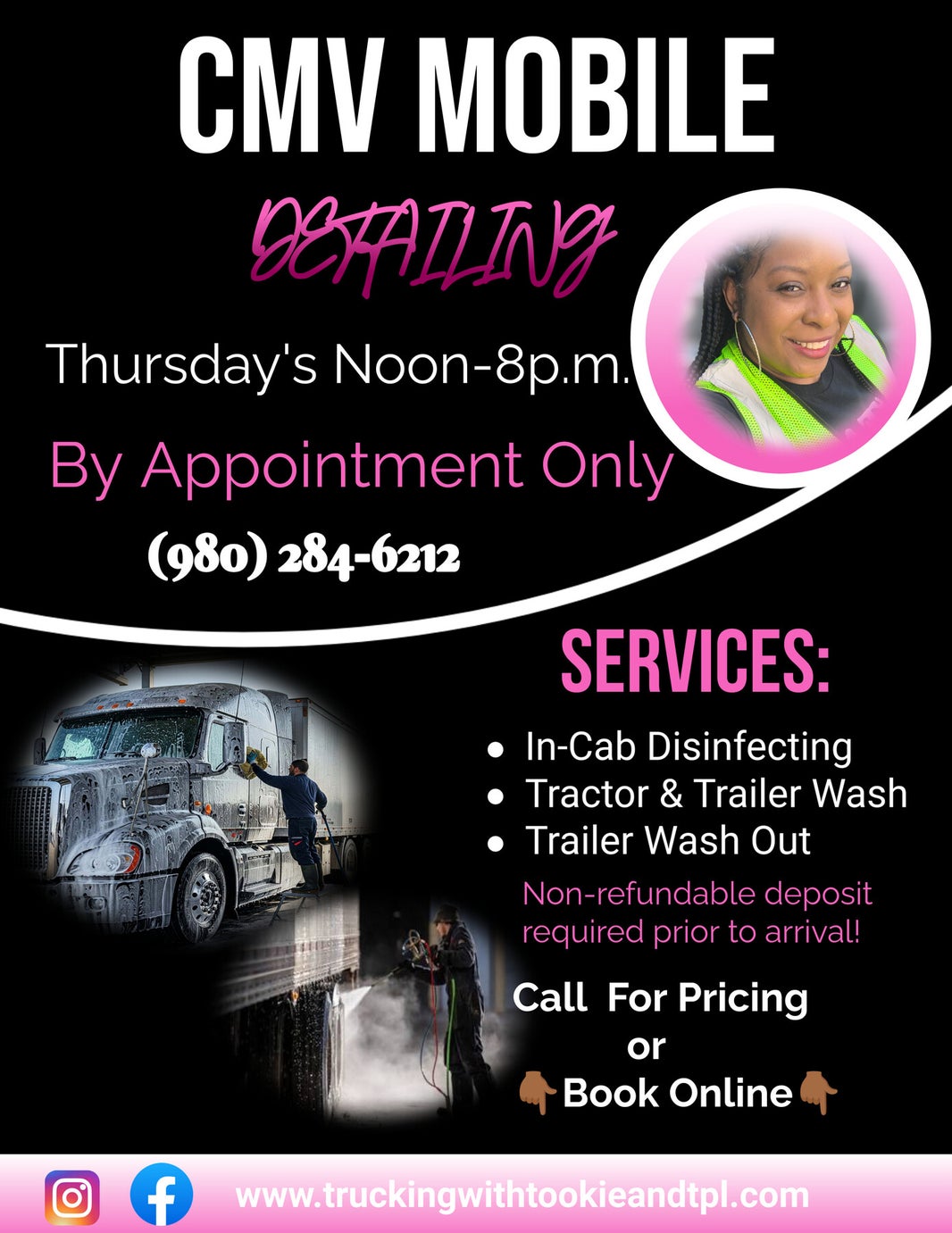 CMV Mobile detailing offers professional, on-the-go detailing services tailored specifically for commercial motor vehicles. Our comprehensive offerings include expert in-cab disinfecting and thorough trailer washouts, ensuring your vehicles are not only clean but also hygienic. But we don't stop there—our unique service experience goes beyond detailing, featuring relaxing manicures and chair massages for drivers, helping them unwind while we care for their vehicles. Choose CMV Mobile Detailing for convenience, quality, and a little personal pampering, all delivered right to your location.